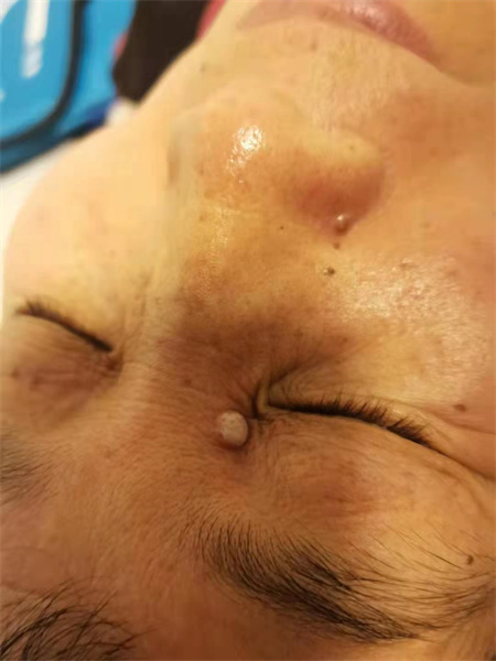 前胸、后背、肩部、颈部以及耳垂有红色的大疙瘩(外伤所致或自发性生长)